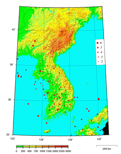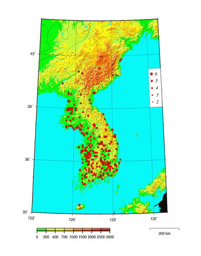 그림은 조선지진연구소 조선지진목록(1984)에서 서기 2년부터 1898년까지 총 1843개 지진에 대한 진앙분포도이다.