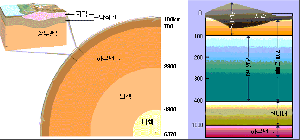 암석권(lithosphere)은 지표에서 100km 정도 두께의 딱딱한 층이며 그 밑에는 암석권에 비해 덜 딱딱하고 온도도 높아 쉽게 변형될 수 있는 층이 존재하는데(상부맨틀) 지진이 일어날 수 있는 깊이의 한계는 여기까지로 지표로부터 약 700km의 깊이이다(그림 2.1). 지진발생의 원인에 대한 학설은 여러 가지가 있으나 대표적 학설은 다음과 같다.